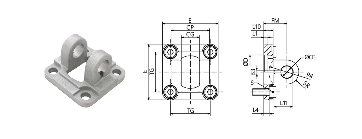 | Ø | Varenr. | E | CP | CG | TG | FM | L1 | L10 | L4 | ØD | ØCF | B3 | L11 | SR | R4 | S |